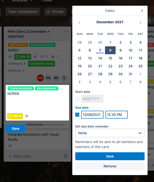 Once the effort has been estimated and the campaign is approved, a deadline for a card is calculated with the team lead and this date can be added to the card by right clicking on it and then clicking on “Edit date”. This is a good practice as just like labels, it provides information of when the campaign is due on quick glance outside of the card. The colors green, orange, red, etc will let us know what’s the status of the campaign in regards to the deadline. The date should be marked done once the campaign is done and delivered.