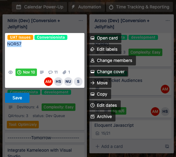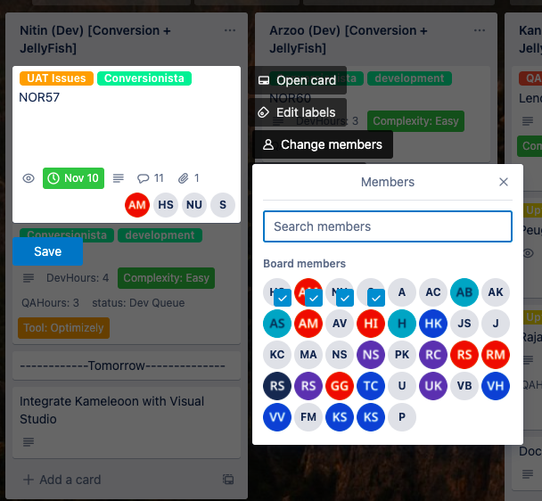 Members on a card are the people the card is assigned to. Whenever we create a card we need to add members to it. The standard practice includes assigning the card to the person who is going to tackle the task including the QA, CRO and the Developer. You can simply right click on the card and a popup list will appear which includes change members, edit list, change cover, copy, move etc. Now click on change member and it will open a member list from where you can add the members into the card. This is a good practice to always add the members who are working on the task so that they will be notified every time there is any update or movement on that particular task. Another significant use is that in case anyone wants to know who has worked on that particular task they can simply know it by seeing the members that have been added. This is very useful in case there is a continuation of any previous task or if a client comes up with any issues after that campaign has been passed, and the card is supposed to be assigned back to the person who initially worked on it.