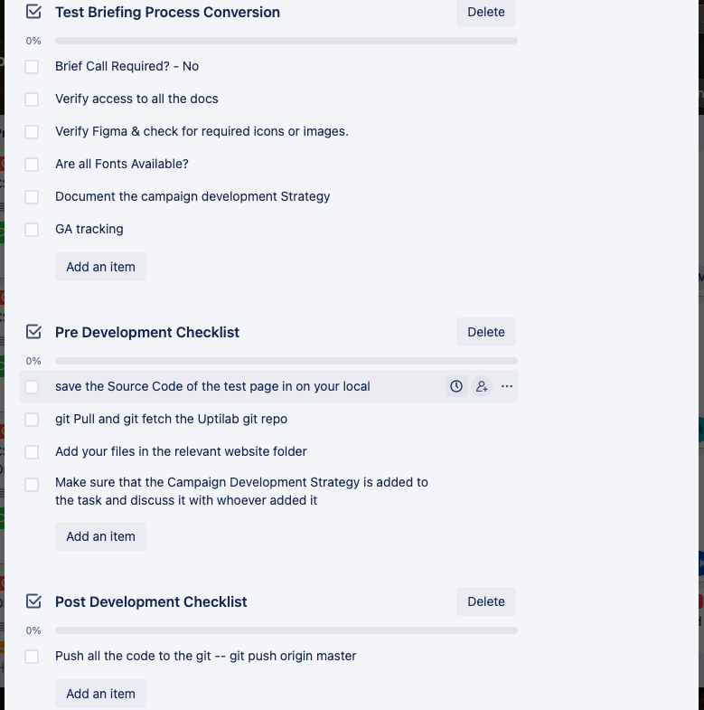 Major difference in the templates are the checklists added inside them. These checklists contain all the pre and post development steps that we need to follow while working on a particular campaign. For new employees, following the checklist when working on the campaign will help you remember all the steps. Make sure you check all the steps as and when needed. This way, other people in the team can also get an idea of your progress with the campaign.