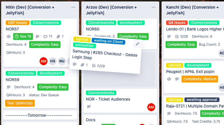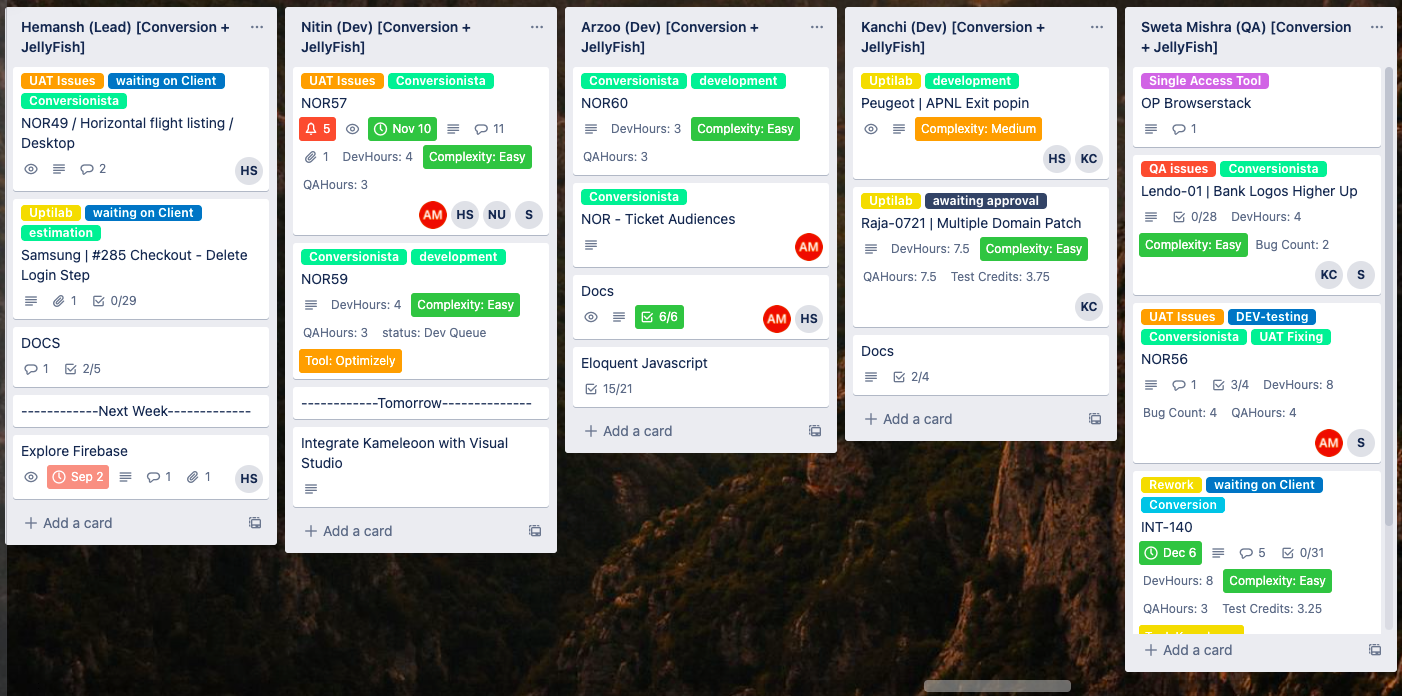 Below I am attaching an image that has team Jellyfish and Conversion members in it and they also have various cards in their list as well. There are various teams divided among us and each of the people is associated with a particular team and they do the campaign under their team. For example, we have a Conversion and Jellyfish team in which the developers and QA are assigned to do all the campaigns that come under Conversion or Jellyfish. Similarly we have a New Republique team in which also there are developers and QAs who do the tasks of the New Republique. Other teams include AWA, Widerfunnel, Internal team, etc. Each person is assigned a particular team and its mentioned alongside their name on top of their list which team they are associated with.