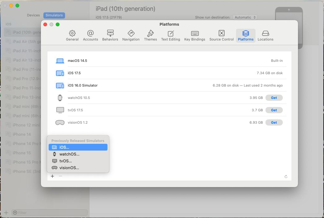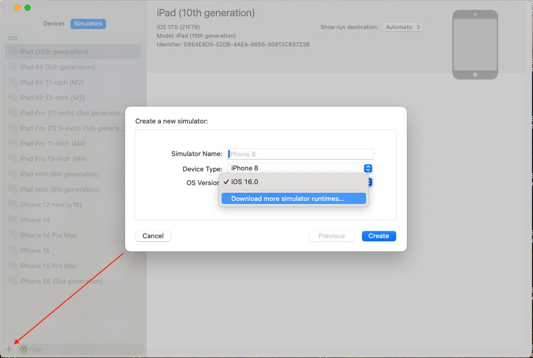 - If the version isn’t installed, click “Download more simulator runtimes…“