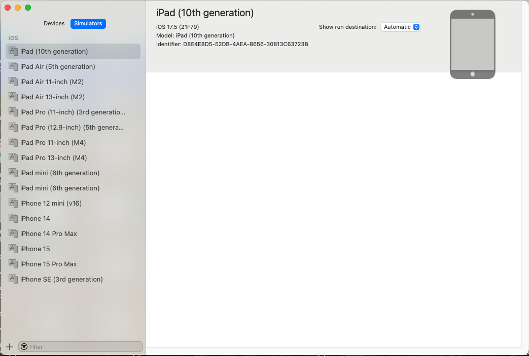 - Browse the list of available simulators organized by device type (iPad, iPhone, etc.)
