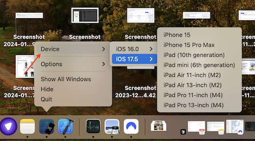 - Add X-Code Simulator on your Dock, and there it will provide you option to use any of the devices and runtimes installed locally